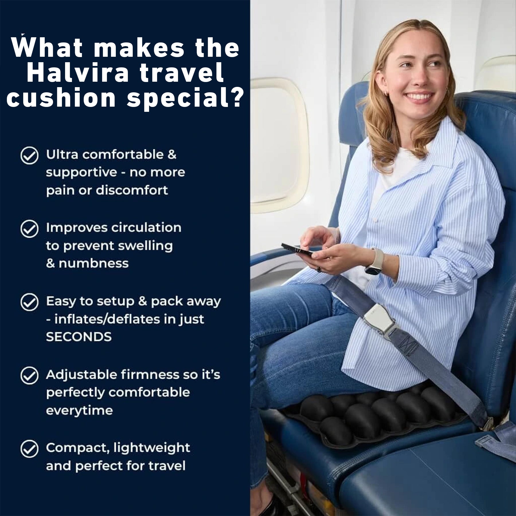 Designed specially for flying, Halvira's inflatable cushion is incredibly lightweight and compact. The portability ensures you never have to lug around a bulky cushion or experience uncomfortable rides ever again.